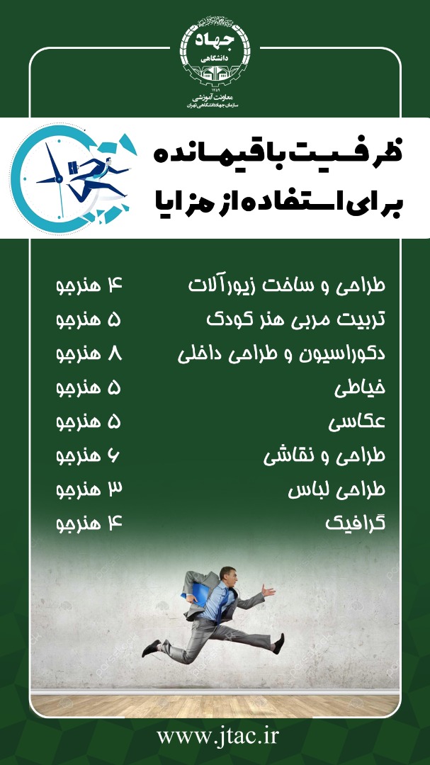 با توجه به محدود بودن ظرفیت استفاده از تخفیف و مزایا، برای شرکت در این دوره ها و بهره مندی از مزایا و شرایط ویژه هر چه زودتر اقدام نمایید.