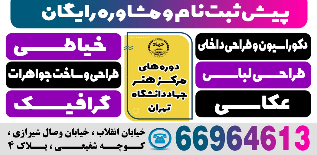 با توجه به علاقه مندان زیاد دوره های مرکز هنر جهاد دانشگاهی تهران و محدود بودن ظرفیت کلاس ها، برای شرکت در این دوره ها و بهره مندی از مزایا و شرایط ویژه هر چه زودتر اقدام نمایید.